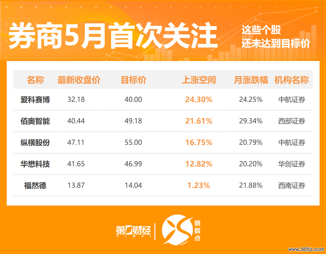 其中,爱科赛博的涨幅空间超24%,该股最新收盘价报32.18元,中航证券在5月18日发布的研报中给出了40元的目标价。