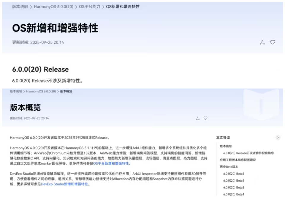 其次,华为开发者官网正式发布了HarmonyOS 6.0.0(20)Release版本,值得注意的是,6.0.0(20)Release不涉及新增特性。